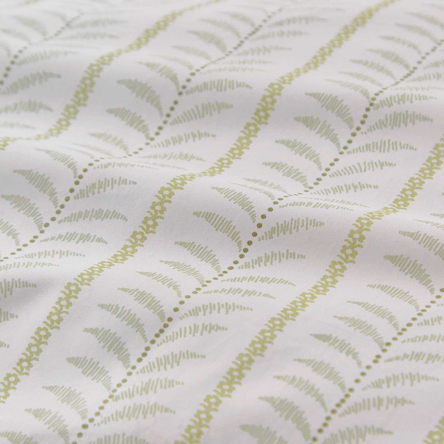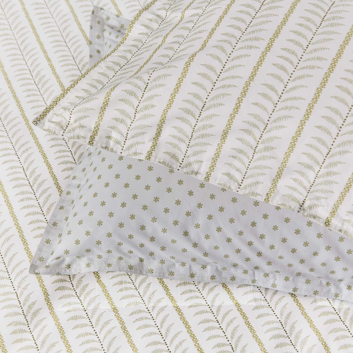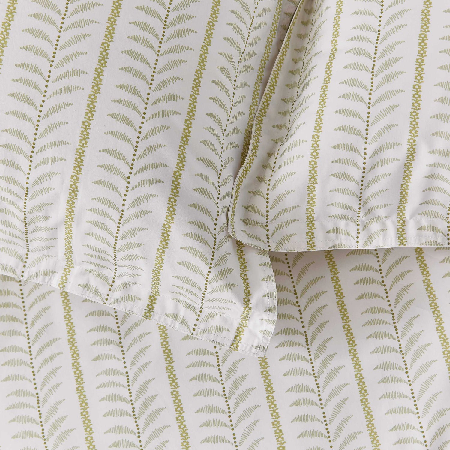 Linden brings a calm, refreshing touch to your home with its soft green tones and quietly intricate design. At first glance, you’ll notice the gentle vertical stripes, but look closer and you’ll find fine dotted lines and graceful feathers captured between meandering floral trails. The reverse reveals a charming ditsy floral print, offering a subtle way to switch up your look. Crafted from smooth 200 thread count cotton percale and finished with a neat twin-needle stitch around the outer edges, Linden blends timeless detail with easy, everyday comfort.