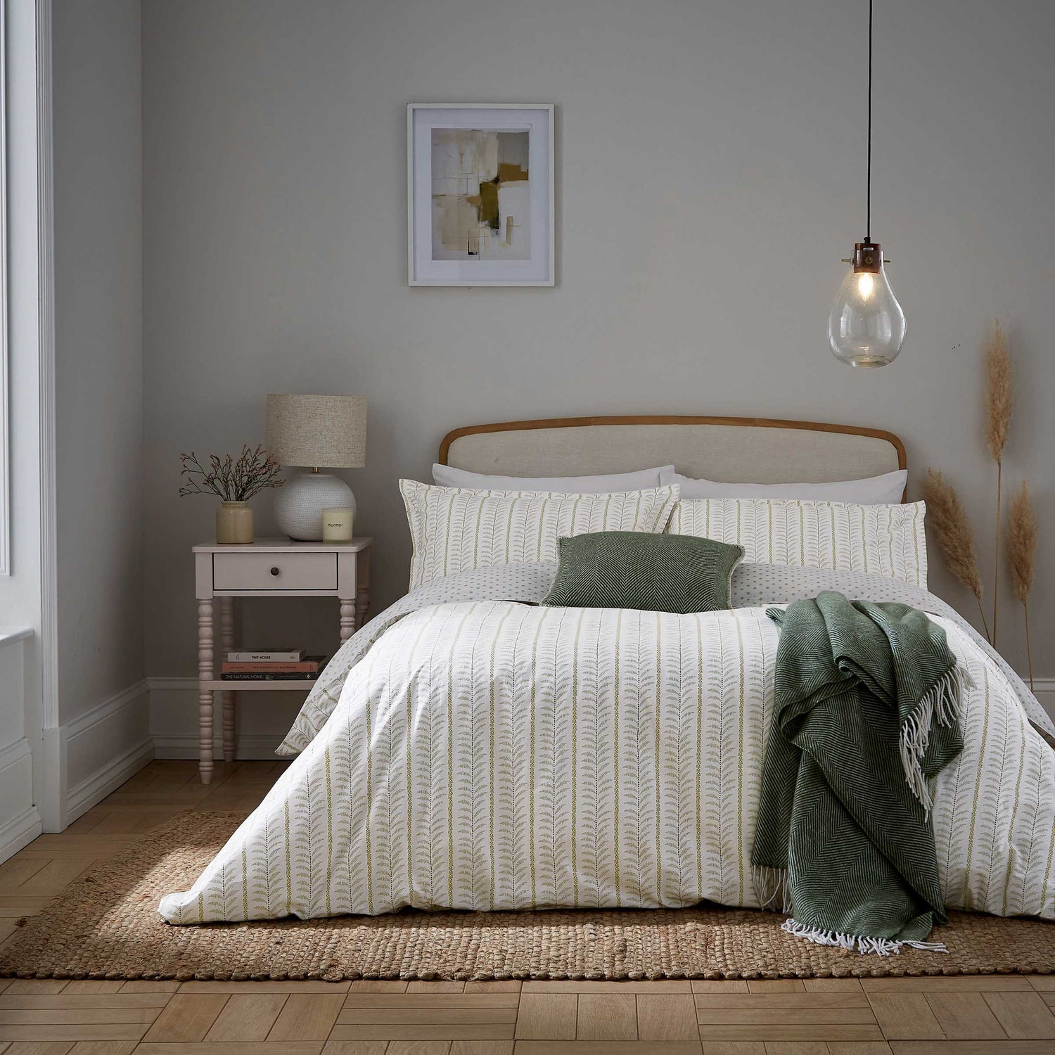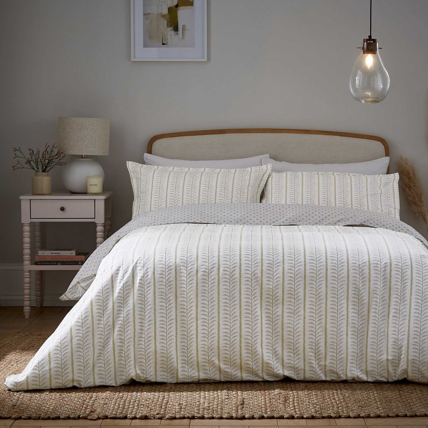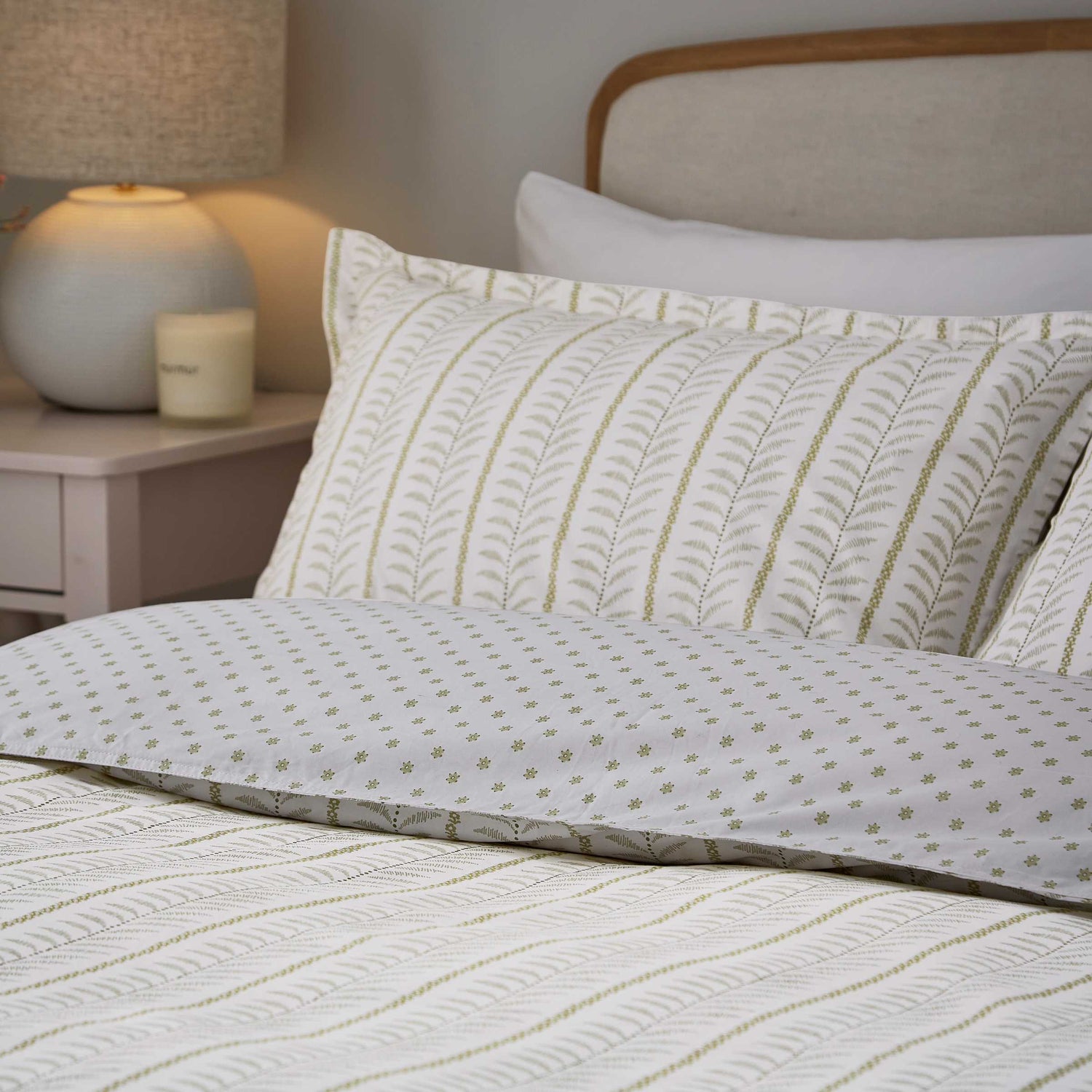 Linden brings a calm, refreshing touch to your home with its soft green tones and quietly intricate design. At first glance, you’ll notice the gentle vertical stripes, but look closer and you’ll find fine dotted lines and graceful feathers captured between meandering floral trails. The reverse reveals a charming ditsy floral print, offering a subtle way to switch up your look. Crafted from smooth 200 thread count cotton percale and finished with a neat twin-needle stitch around the outer edges, Linden blends timeless detail with easy, everyday comfort.
