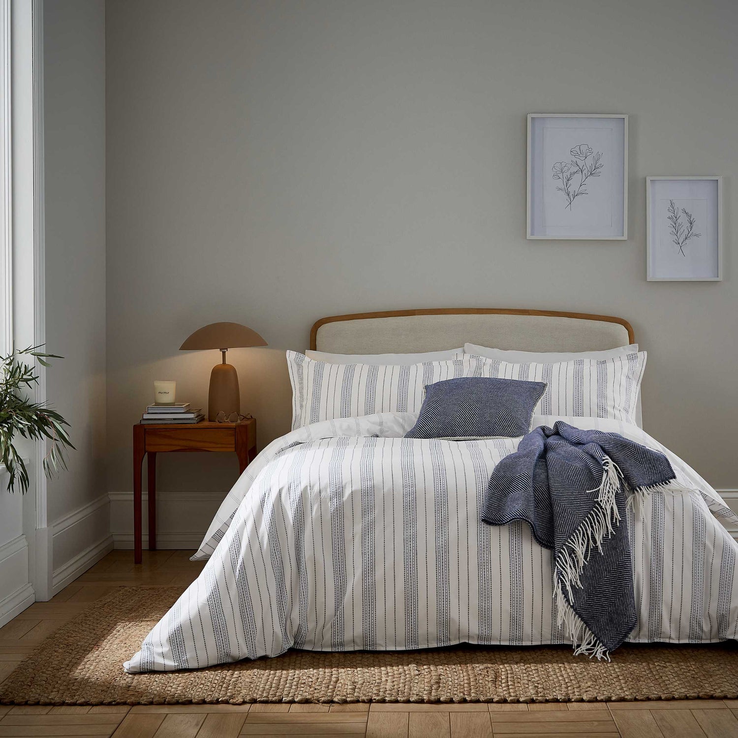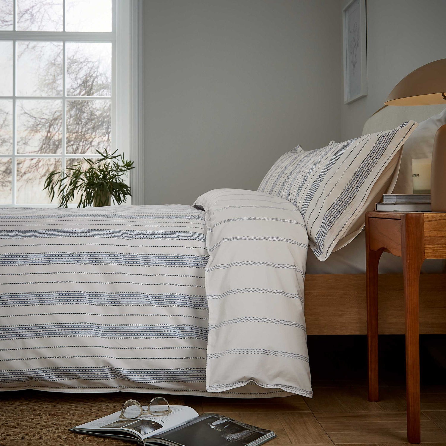 Lora adds a touch of crafted charm to your bedroom with its softly stitched-inspired stripe design. The pattern combines a running stitch with delicate star motifs, creating a look that feels both subtle and beautifully intricate. On the reverse, fine spotted stripes offer a fresh, versatile contrast. Printed on smooth 200 thread count cotton percale, each duvet cover set is finished with a refined twin-needle stitch along the edges. Available in four sizes, Lora brings effortless texture and comfort to your space.